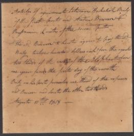 Agreement, August 13, 1808 Only a few years after acquiring her for the (speculated) sum of $1000, Hachaliah Bailey leased two-thirds of the use of “The Elephant� for one year to Andrew Brunn and Benjamin Lent, for $1200 each. SHS 74.3.1 The William & Nancy Bailey Collection